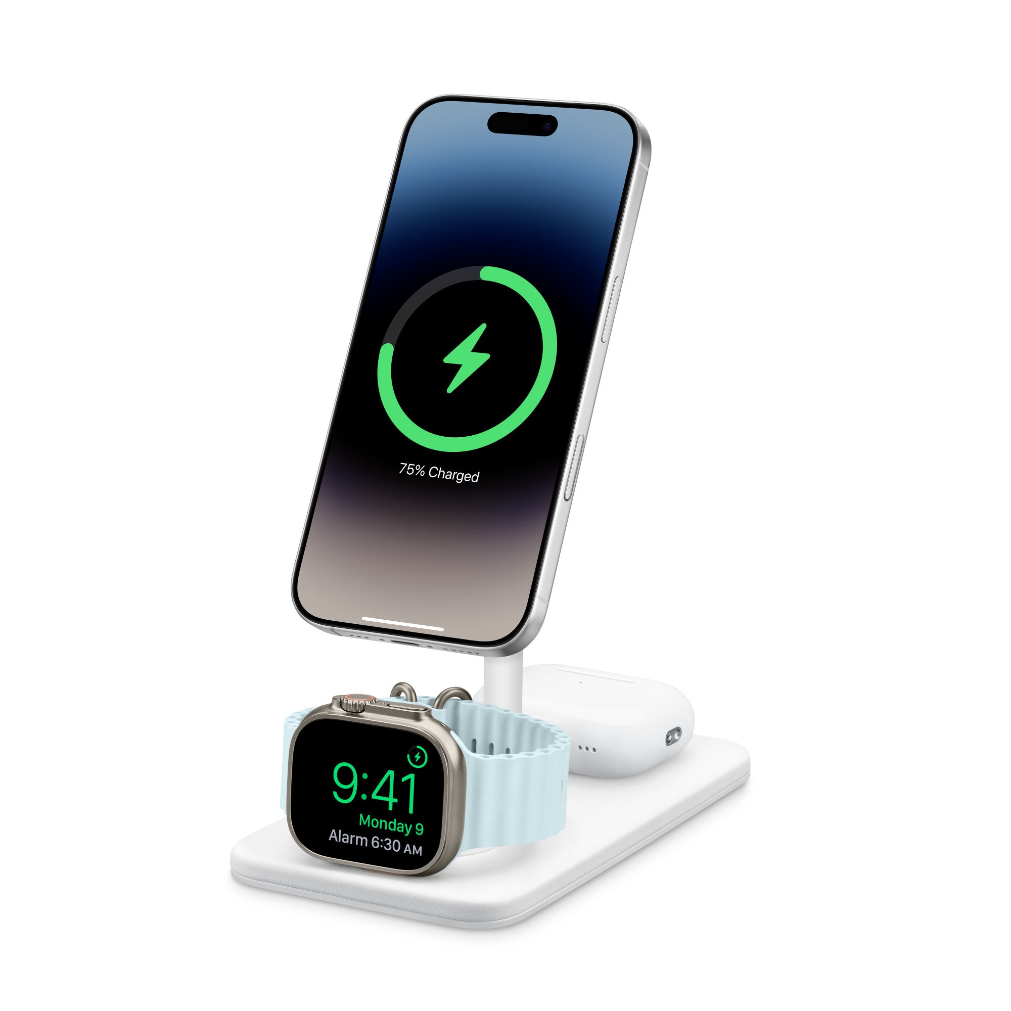 3-in-1 Wireless Charging Stand is a sophisticated 3-in-1 Qi2 wireless charger for your iPhone, AirPods, or other compatible devices. This sleek stand not only saves space but also elevates your phone, allowing you to position it vertically or horizontally for an optimal StandBy experience.