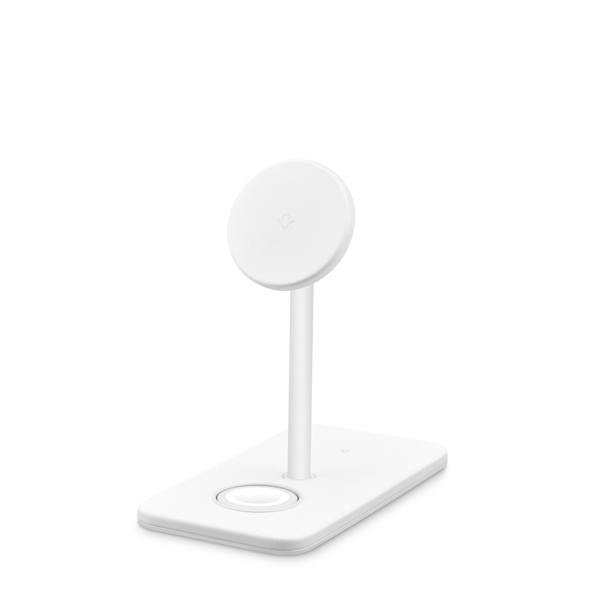 Its aluminum post and vegan leather-wrapped base support a 15W wireless Qi2 magnetic charger, a 5W wireless charger on the base, and an integrated Apple Watch fast charger. This charger flips up to keep your Apple Watch in Nightstand mode, offering seamless power in one compact, stylish stand.